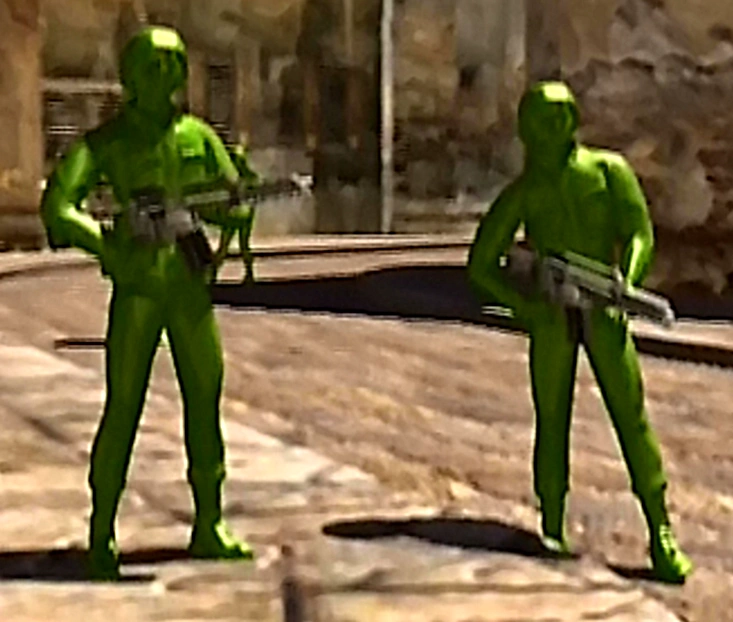 The Green Army is led by Col. Grimm, who, despite his title, acts and dresses like a General. In Sarge's Heroes, Vikki Grimm states that the Green Army is the head of an alliance of nations against the Tan Nation, although the other nations are never mentioned. Despite their numerical setbacks, the Green Army has some things going for it. For example, the Green Army has the elite Bravo Company, led by decorated war veteran Sgt. Hawk. The second advantage that the Green Army has is technological superiority, as shown in the Omega Program and the invention of the Air Cavalry. The majority of the Green Army was assembled at the peace treaty signing in Army Men: Sarge's War, and apparently met its firey demise by a bomb hidden in the Peace statue, courtesy of Operation Vengeance. However a few Green soldiers were captured by the Tan, in which Sarge freed them before killing Lord Malice, but it remains unknown to what happened to them after. Also, it is unknown if heroes such as the Omega Soldier or Captain William Blade were present.